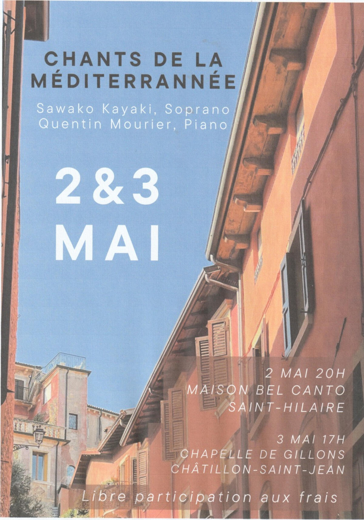 L'association Fest'Hil'Airs vous invite pour un voyage en Méditerranée au travers de mélodies et airs d'opéra inspirés du folklore grec, français, italien et espagnol Chant : Sawako Kayaki Piano : Quentin Mourier
